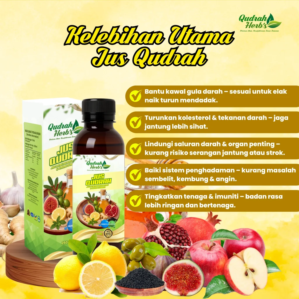 Jus Qudrah diformulasi hasil gabungan bahan sunnah yang telah dikaji di peringkat antarabangsa, ditambah pula dengan proses R&D yang teliti bagi memastikan kualiti dan keberkesanan terbaik. Setiap botol dihasilkan mengikut piawaian keselamatan dan kebersihan, supaya anda boleh amalkan dengan penuh yakin.